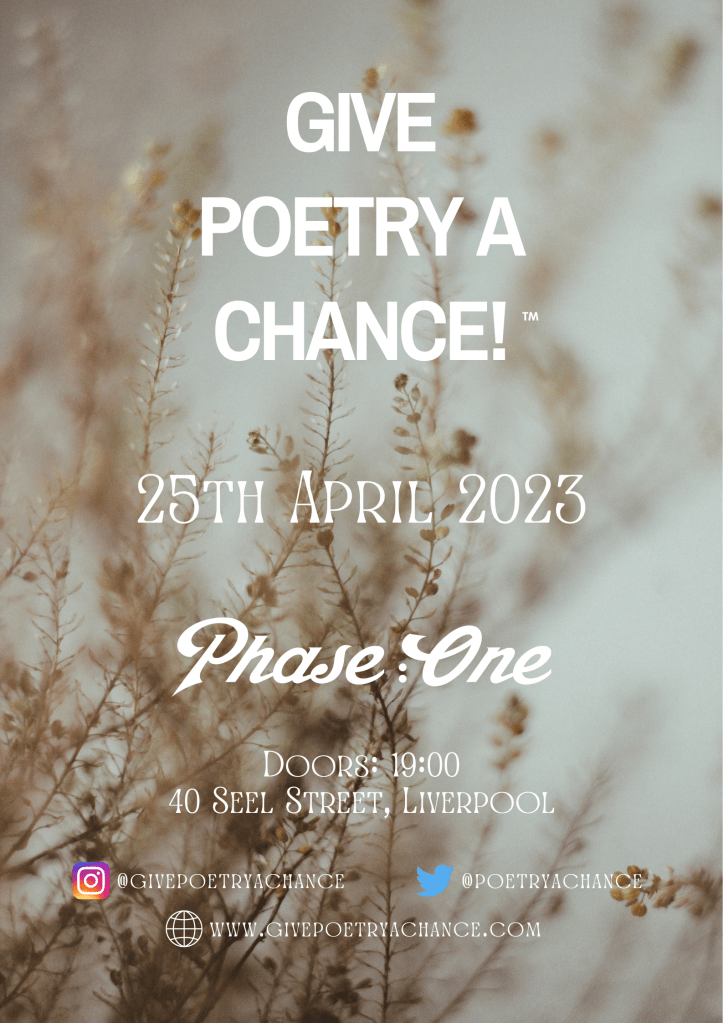 Please note that the lineup has now been booked and there are currently no spaces to perform at the event. If you would like to perform at a future Give Poetry A Chance event, please send an email to: givepoetryachance@gmail.com